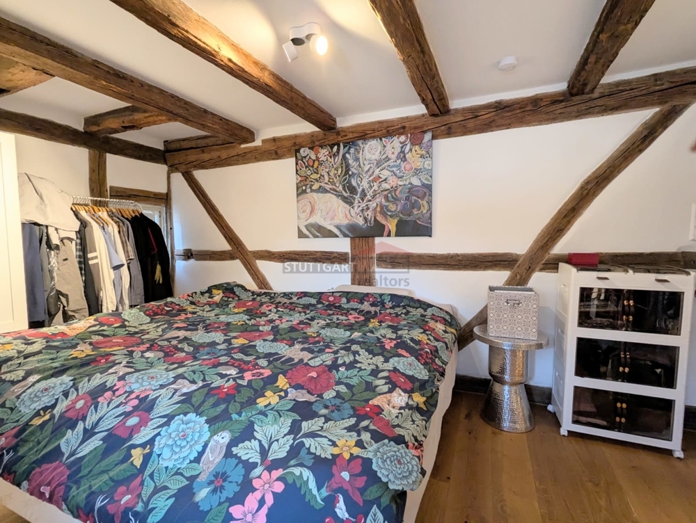 The semi-detached house (2 units available) for rent is a first-time occupancy after extensive and elaborate refurbishment. The house is located in the centre of Ostfildern-Kemnat in a unique listed building (cultural monument) whose original year of construction is estimated to be the 16th/17th century. The house has five rooms on three floors. The property impresses with the charm of a cultural monument in combination with the very high-quality living rooms with new oak parquet flooring, underfloor heating in some areas, a new fitted kitchen and a spacious daylight bathroom with a floor-level shower, large tiles, double washbasin and WC. There is also a guest WC on the ground floor. Washing machine and tumble dryer connections are located both in the house and in the basement area. The vaulted cellar belonging to the house is separately accessible and has also been upgraded and offers plenty of space and storage. The house and the hot water are heated by a new air source heat pump. A photovoltaic system has been installed on the roof and provides electricity for basic utilisation. In combination with green electricity, this results in CO2-neutral energy production and consumption. Thanks to the appropriate insulation measures in conjunction with the energy technology, KfW Efficiency House status for listed buildings EE was achieved.